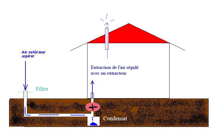 -* faire parcourir au moins 20 m de tuyau (diamètre 160 mm) a l'extérieur de la maison à une profondeur d'environ 2 m. Réaliser un légère pente (1 à 2%) entre l'entrée d'air (extérieur) et la sortie (arrivée au bas de la maison).